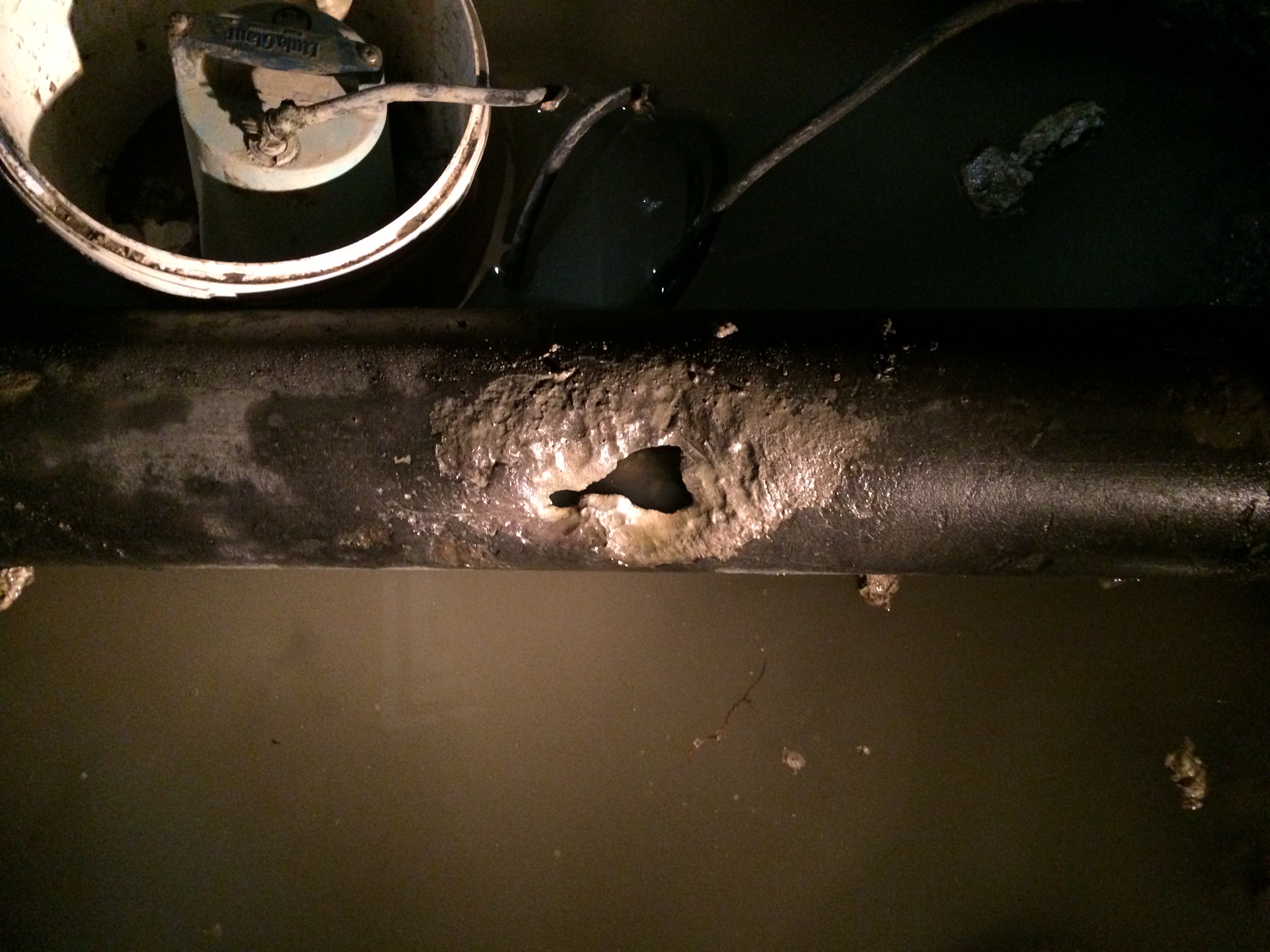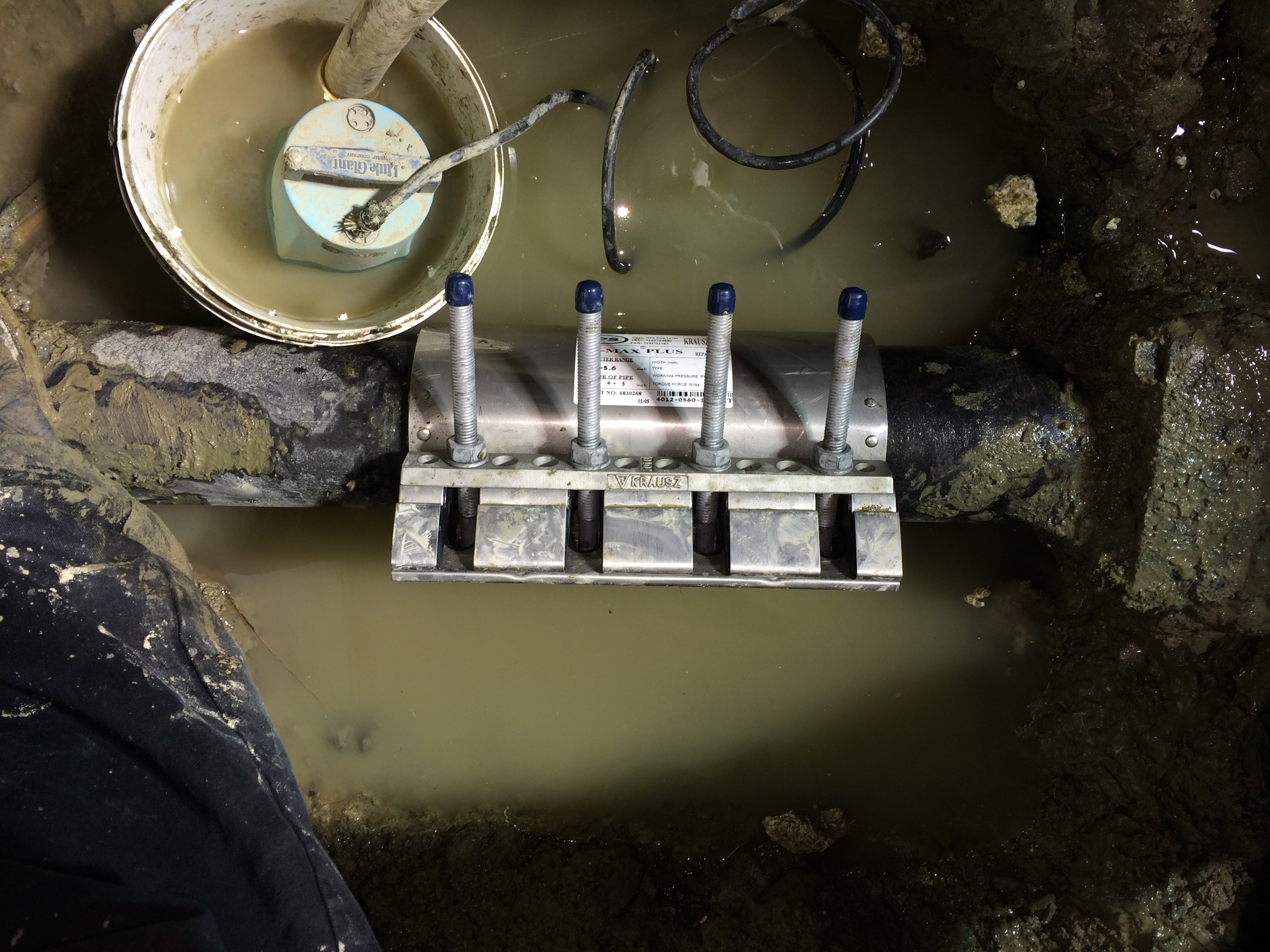At CALLAWAY Plumbing and Drains Ltd we get the call for water leaks. This 4″ ductile iron water line is servicing a high rise apartment building and after many years being surrounded with rocks a hole was worn through the pipe to create this leak. Water mains are made of various materials and they should never be back filled with rocks or any other sharp or hard objects, always bed in sand and fill at least 1-2 feet on top with sand.
