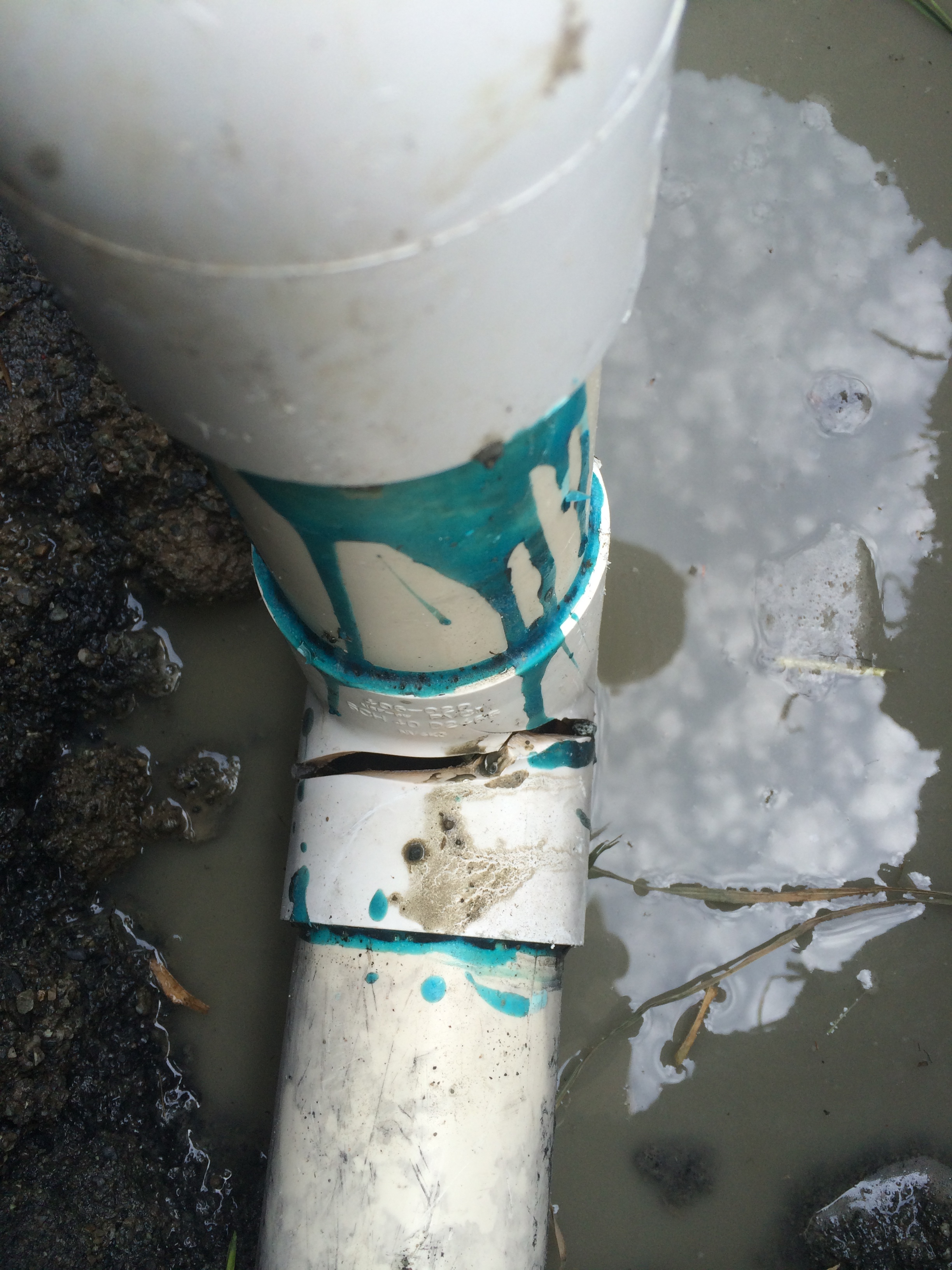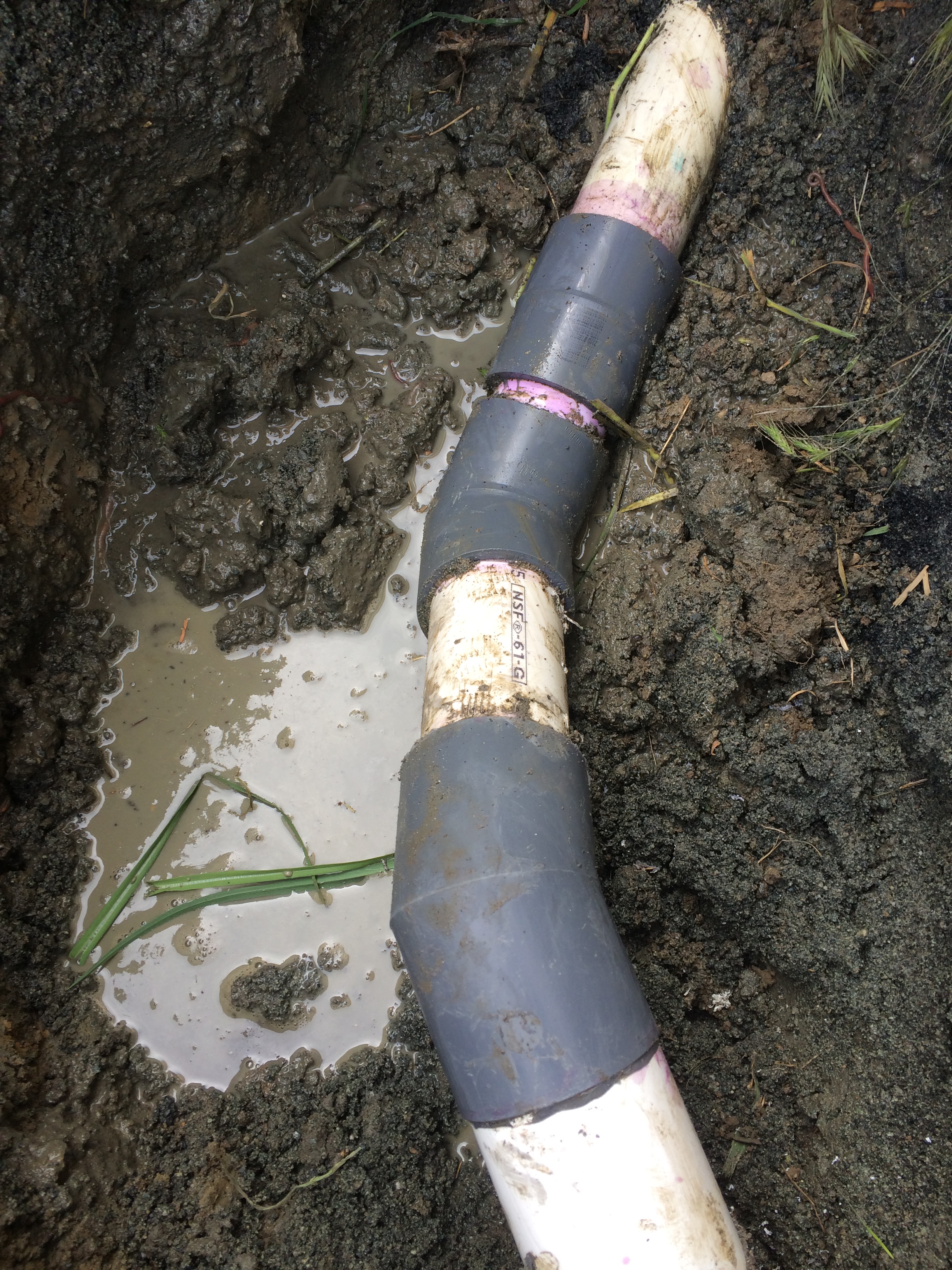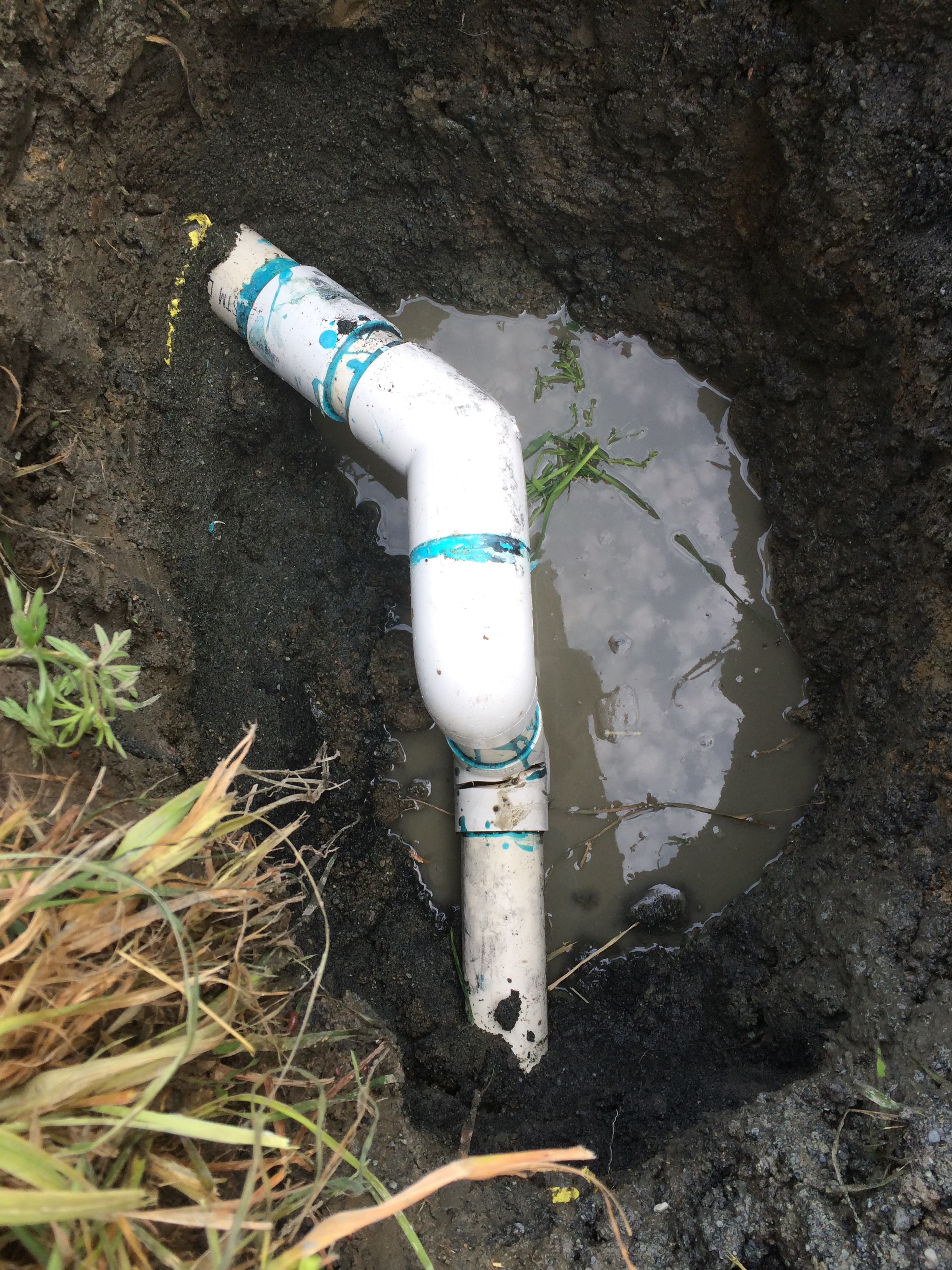 CALLAWAY Plumbing and Drains Ltd. was called to investigate a sewer odor, after walking around the property to find the sewer lateral and finding a sewage pump station on site, we then noticed a wet depression in the ground. We then excavated the area to find that the discharge line was installed with regular PVC schedule 40 fittings the wrong glue and that a 90 degree elbow had cracked and was pumping the effluent into the soil. CALLAWAY Plumbing and Drains Ltd. installed new schedule 80 PVC fittings to replace the cracked fitting and then recharged the sewage pump discharge line. This is code that on ALL PVC pump discharges that the PVC pipe be primed, grey glue and that schedule 80 fittings are used for all elbows and that the pipe is painted with purple paint to mark as non potable.