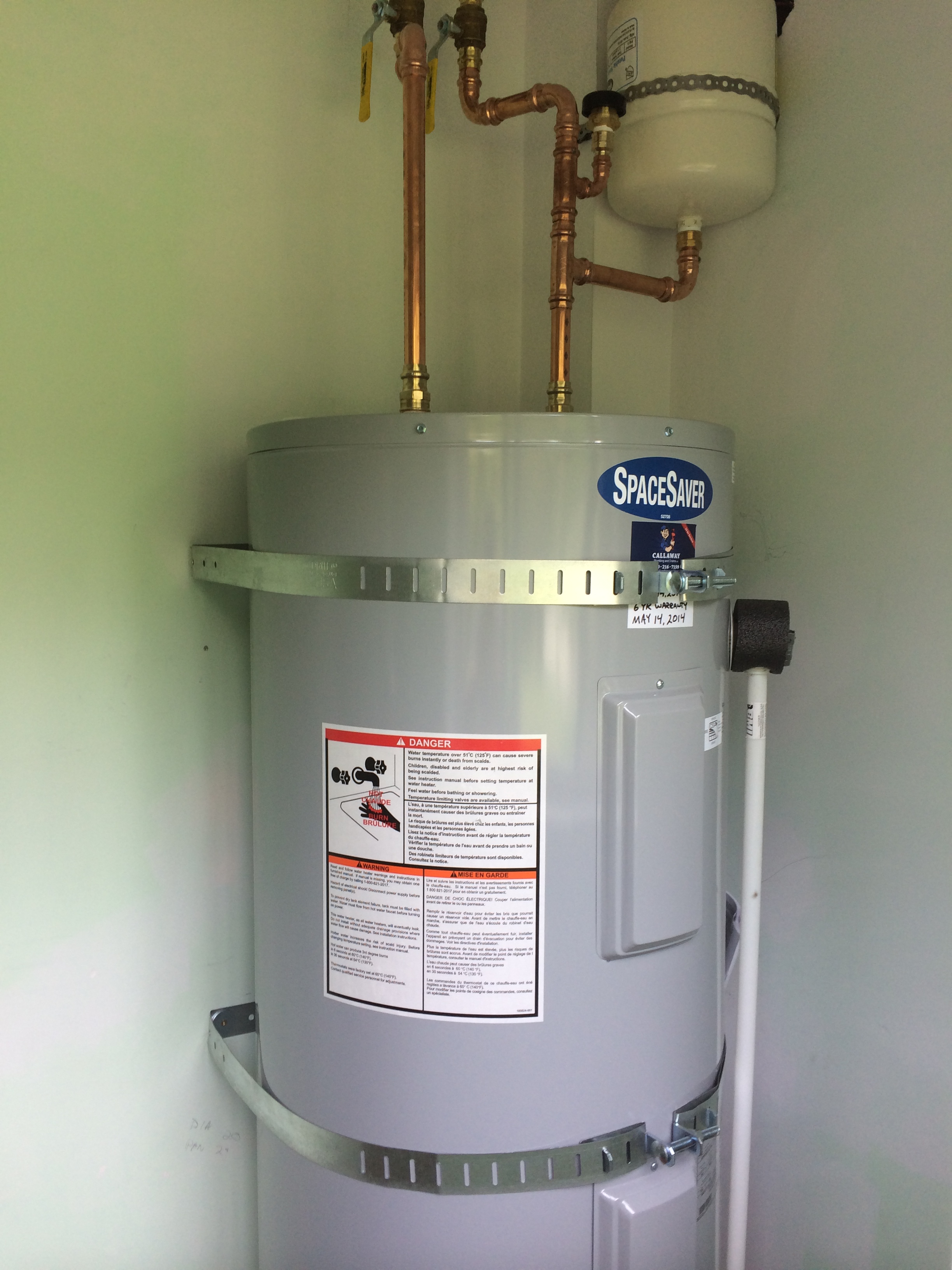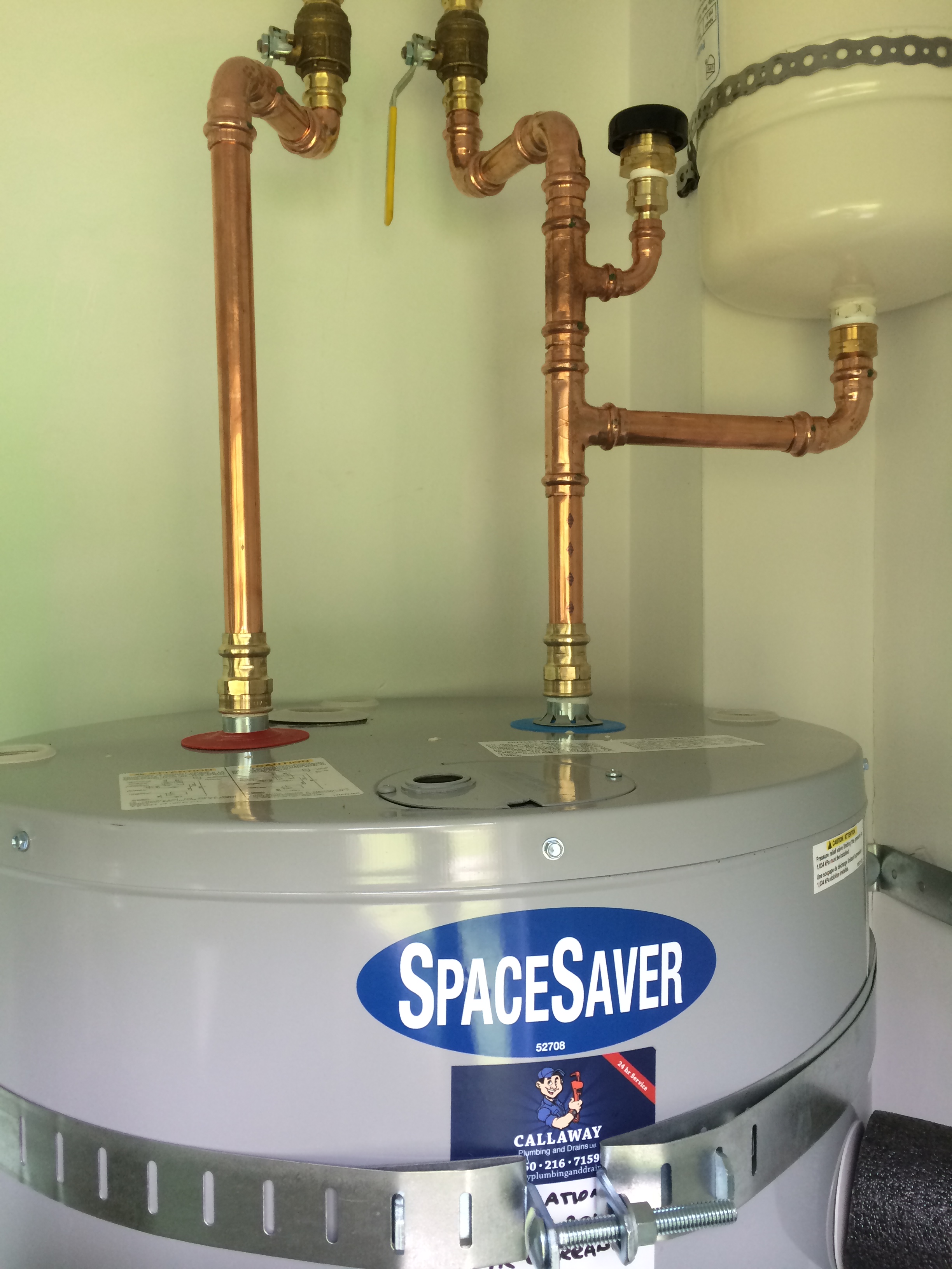New John Wood space saver hot water tank installed in a closet for a new secondary suite. The team at CALLAWAY Plumbing and Drains Ltd. installs to meet with today’s code requirements. Thermal expansion tank, seismic strapping and drain pan, we also install ball valves on both the cold water inlet and the hot water outlet for added insurance of isolating the hot water tank in case of and emergency .